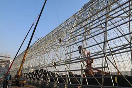 電廠煤棚網(wǎng)架用高空拼裝法進(jìn)行安裝,是先在設(shè)計(jì)位置處搭設(shè)拼裝支架,然后用起重機(jī)把煤棚網(wǎng)架構(gòu)件分件(或分塊)上吊至空中的設(shè)計(jì)位置,在支架上進(jìn)行拼裝。此法有時(shí)不需大型起重設(shè)備,但拼裝支架用量大,高空作業(yè)多。因此,對(duì)高強(qiáng)度螺栓連接的、用型鋼制作的鋼網(wǎng)架或螺栓球節(jié)點(diǎn)的鋼管網(wǎng)架較適宜,目前仍有一些鋼網(wǎng)架用此法施工。